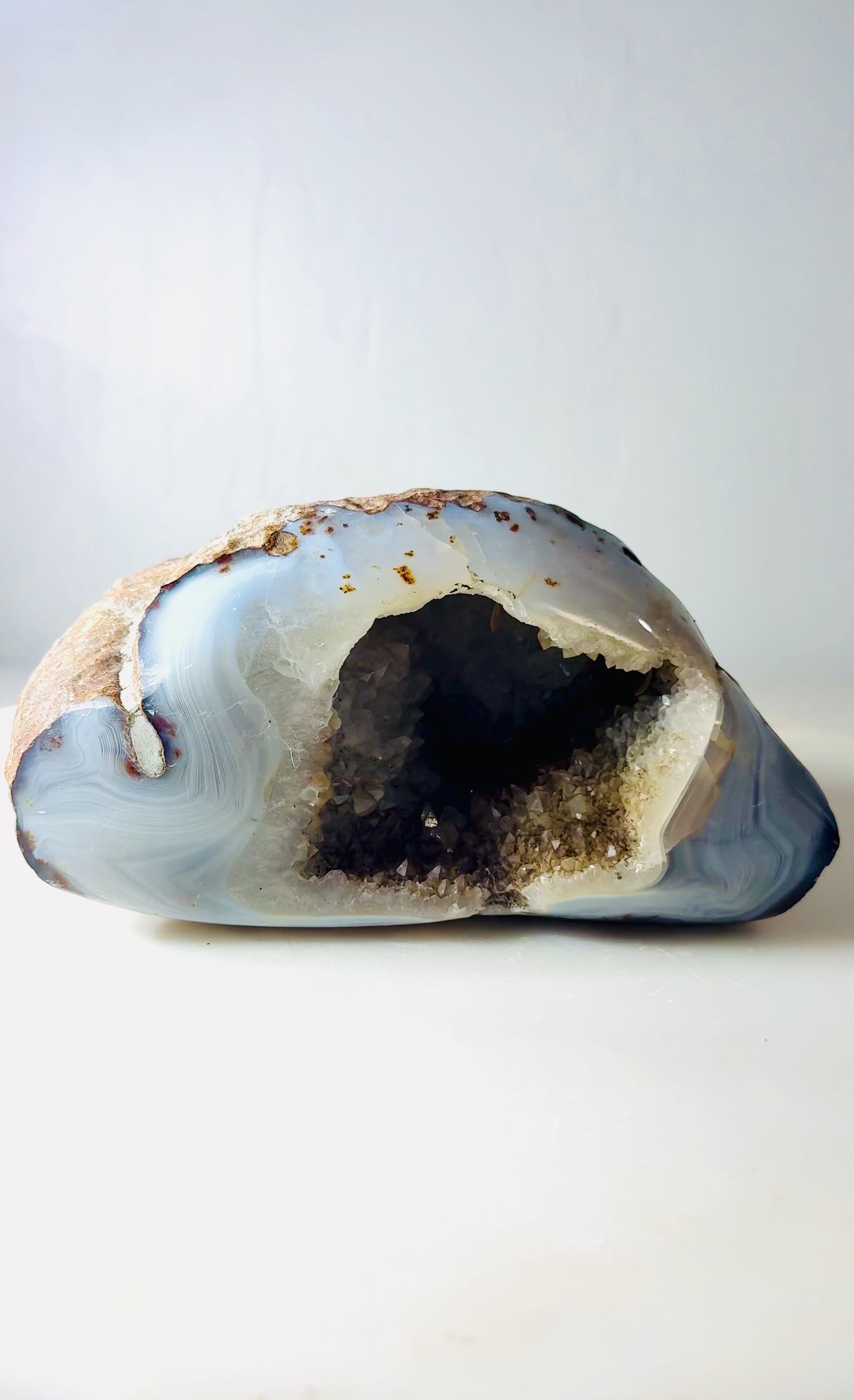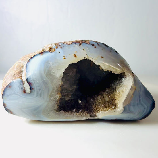 The exterior retains its natural, earthy texture, while the interior reveals a crystalline cavity with subtle translucency and depth. The contrast between the rugged outer shell and the luminous druzy interior makes this piece especially striking as a decorative object or collector specimen.