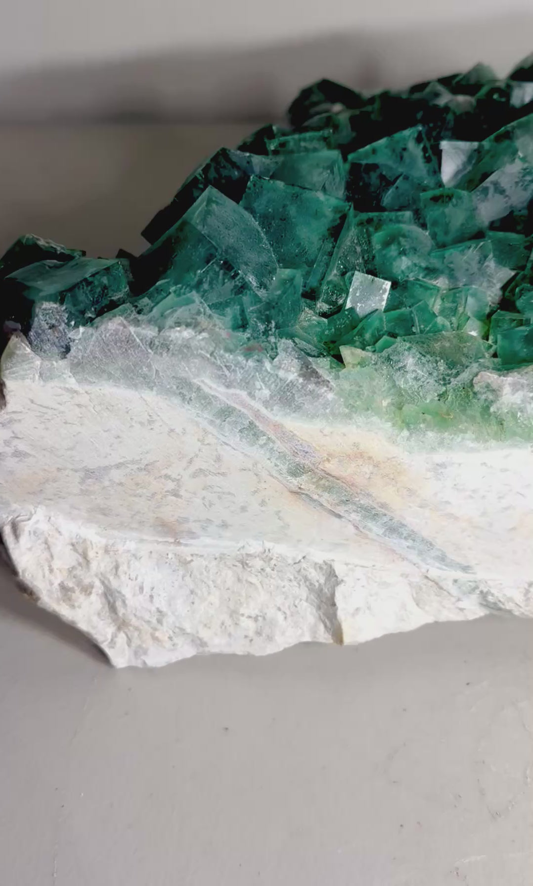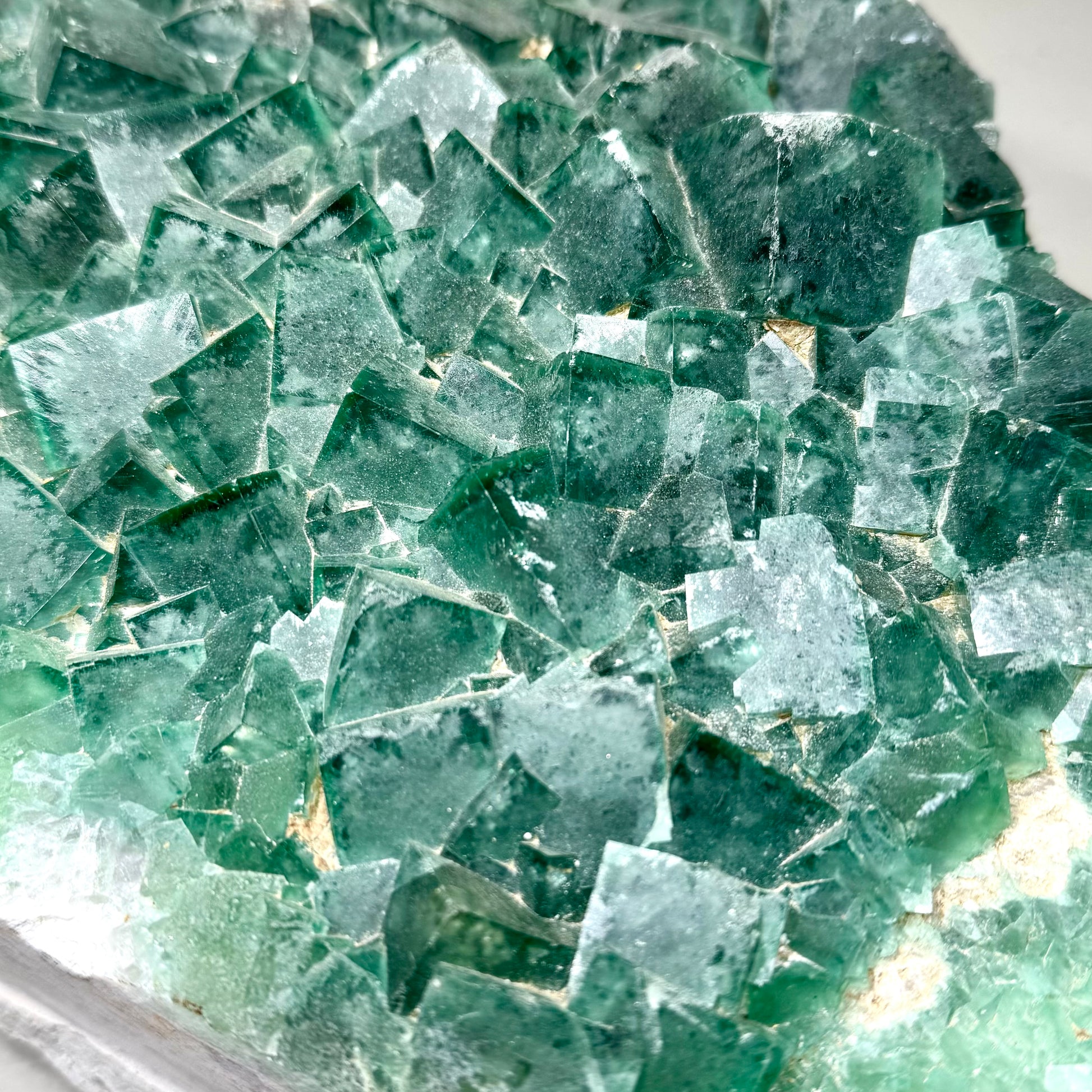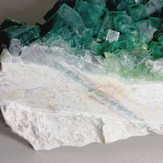 With its monumental scale and frosted translucent cubes, this fluorite specimen embodies both geological precision and artistic chaos. Its light-catching surfaces and dynamic structure make it a captivating centerpiece for mineral collectors and design enthusiasts alike.