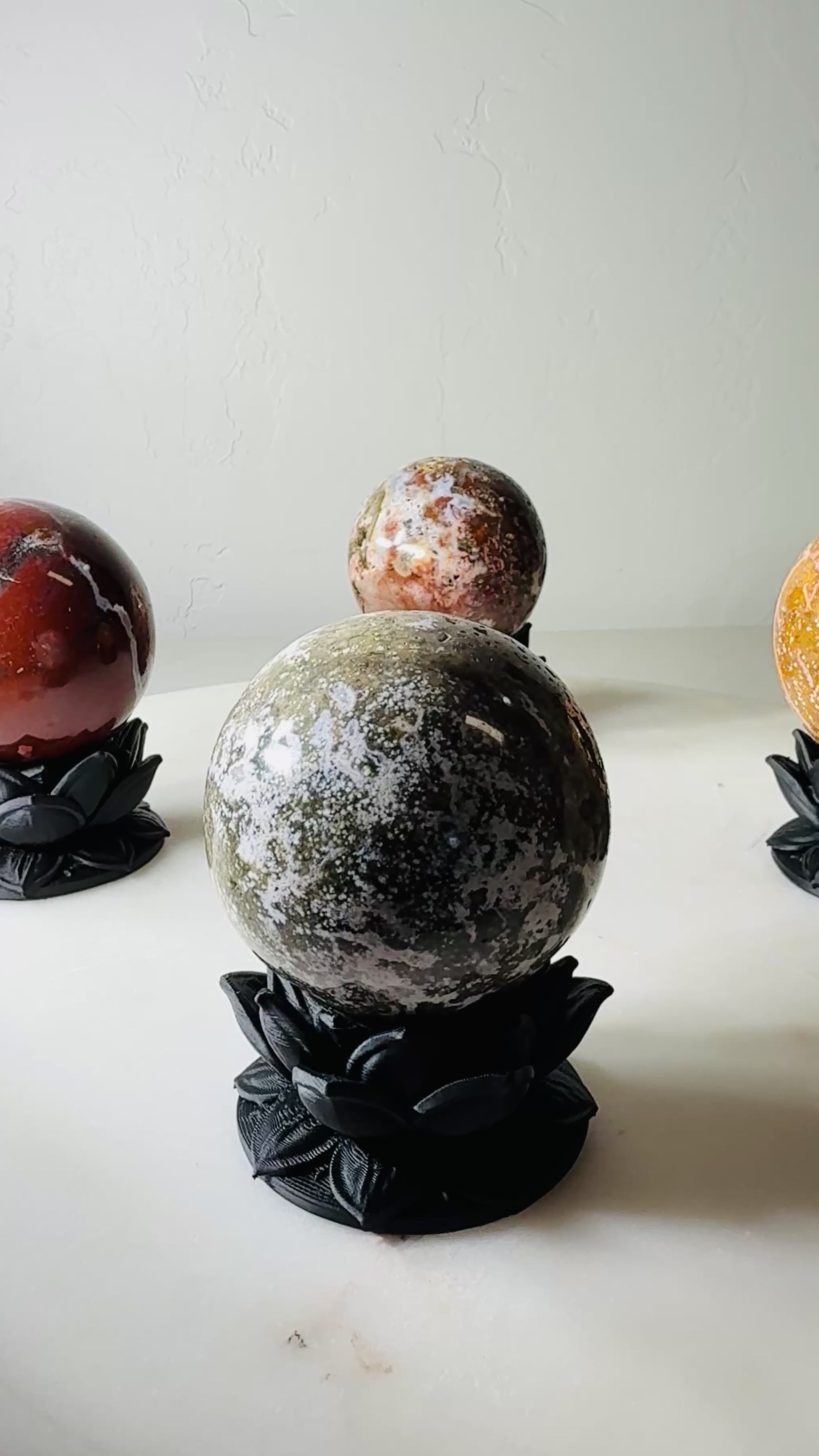 This listing features our original Dark Lotus stand, designed and handcrafted by Kreateur Studio, paired with a handpicked crystal sphere selected from the chosen variation. The stand is a sculptural, floral-inspired design created in-house and produced in small batches, making it a distinctive display piece even on its own.