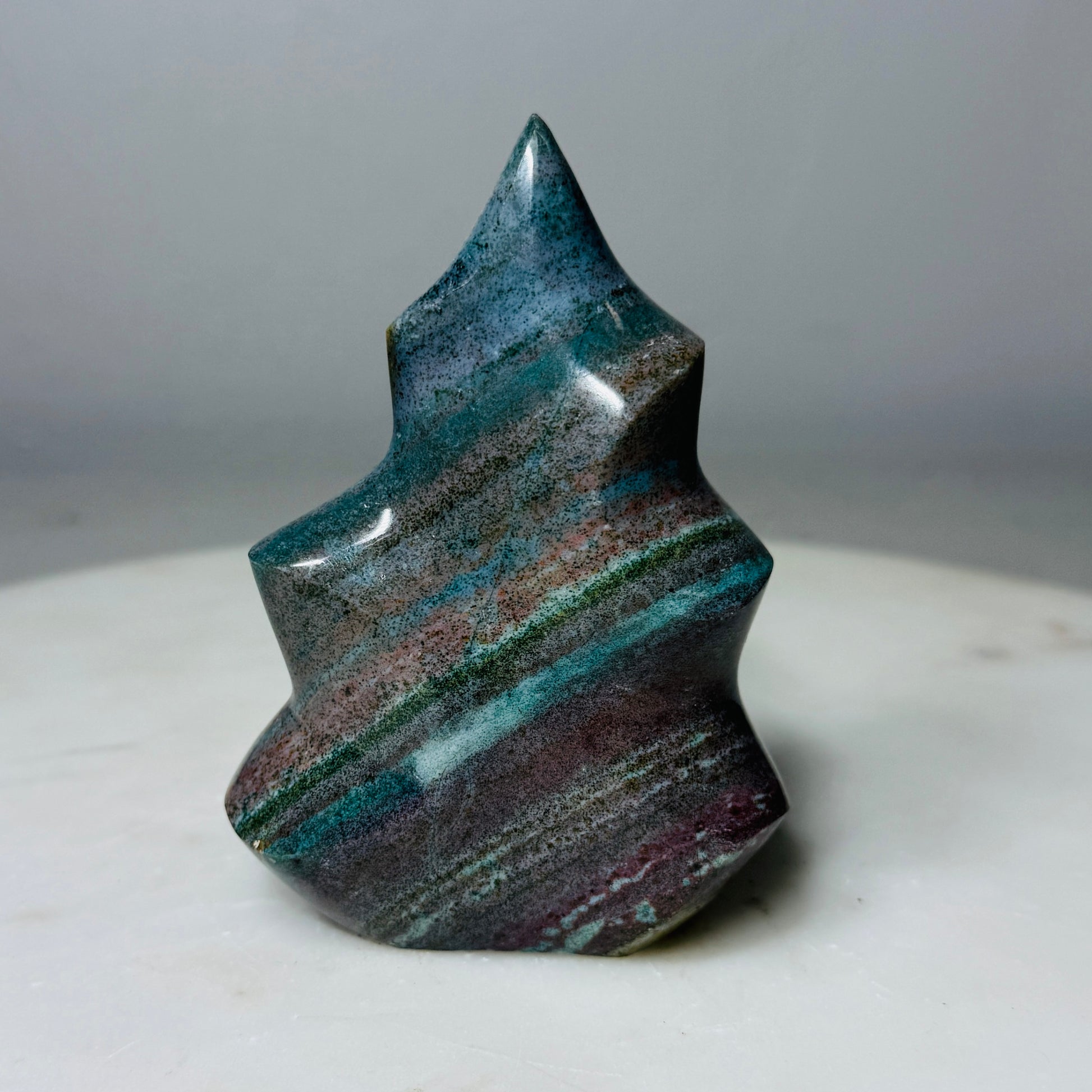 A polished Mystery Jasper flame carving featuring a natural mix of earthy tones, patterns, and movement unique to each piece. This is a no sub-variety selection listing, meaning each flame is intuitively chosen and may include different types of jasper with varying colors, banding, speckling, or scenic formations. Every carving is one of a kind.