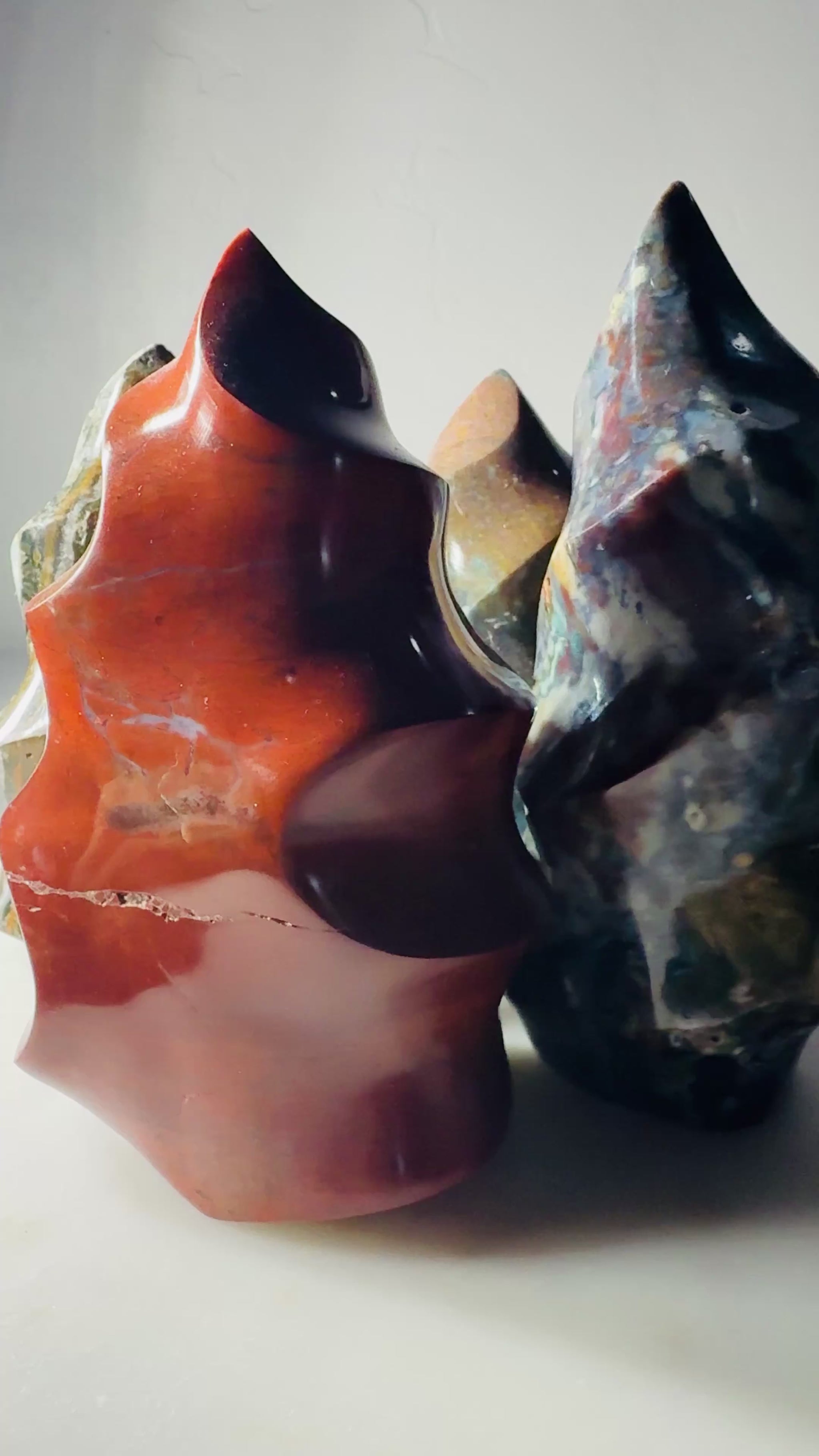 Smoothly polished and well-balanced, these jasper flames make striking statement pieces for shelves, desks, or curated crystal displays.