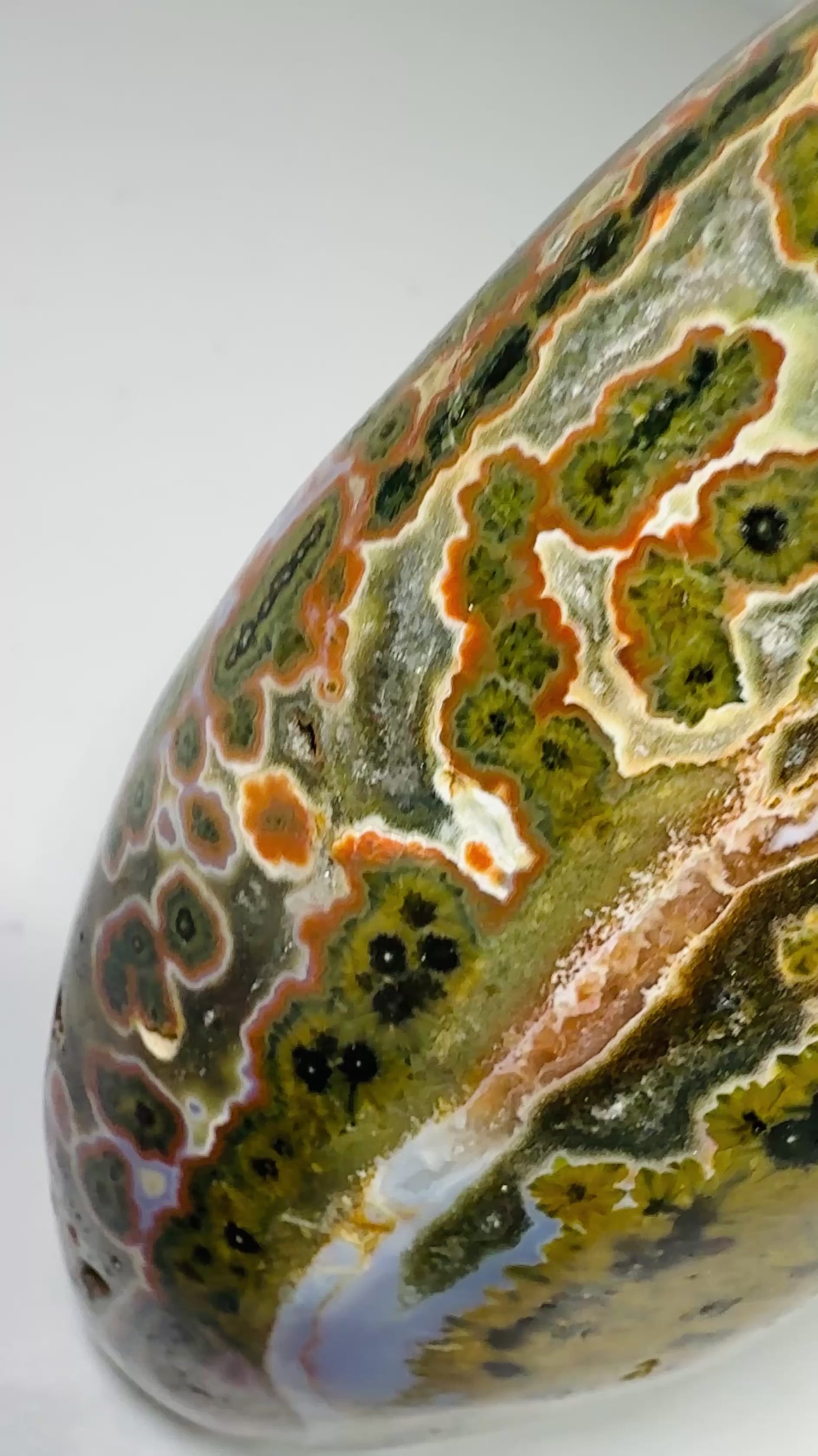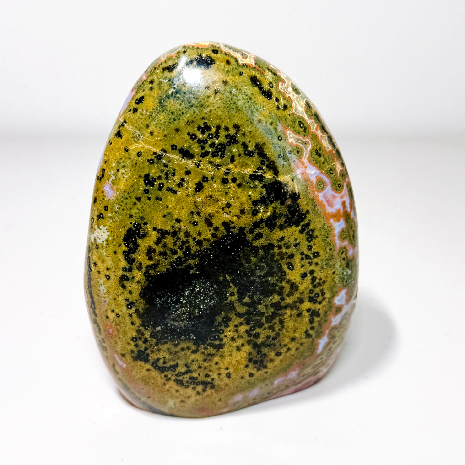 This Small Rare Polished Kabamby Ocean Jasper Specimen showcases an exquisite olive green matrix enriched with intricate orbicular formations. Splashes of vivid red, soft lavender, and subtle pink hues dance across the surface, creating a painterly, mosaic effect that makes this piece truly one of a kind.