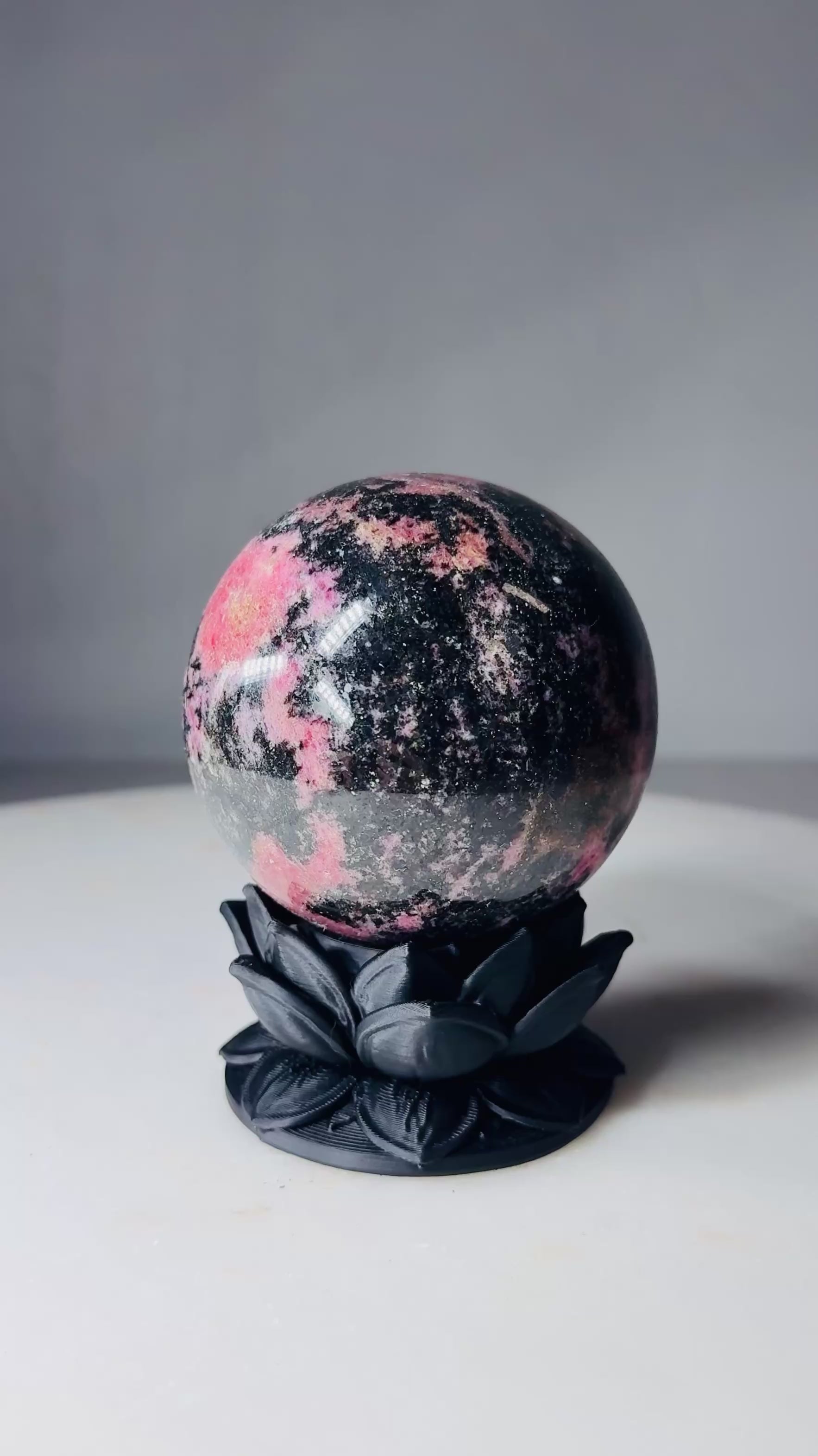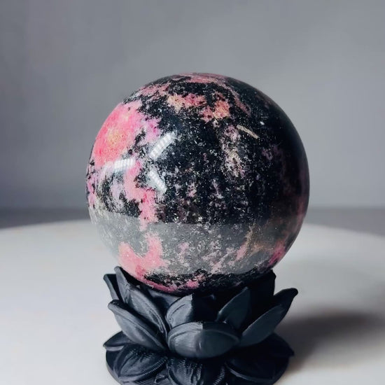 A handpicked rhodonite sphere displayed on a sculptural dark lotus 3D printed stand, handcrafted by Kreateur Studio. Each sphere is carefully selected for quality and character, featuring natural pink tones with black manganese veining. Due to natural variation, the stone you receive will be similar in quality and style but not the exact piece shown.