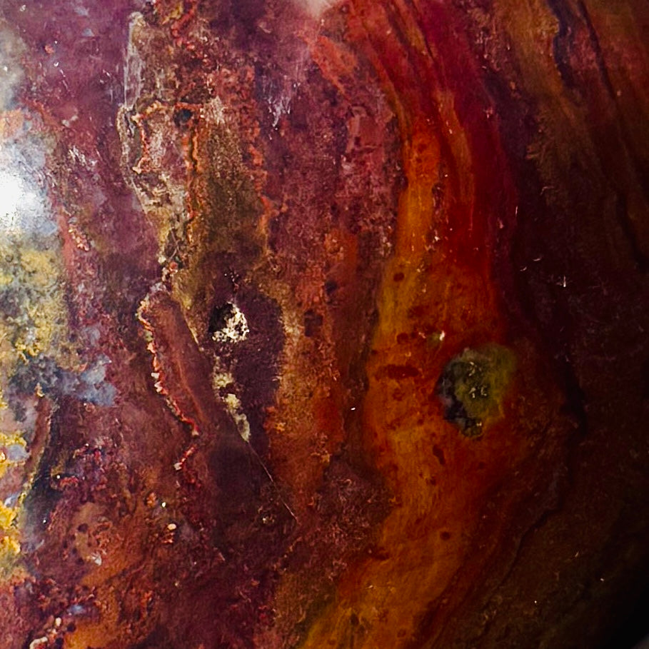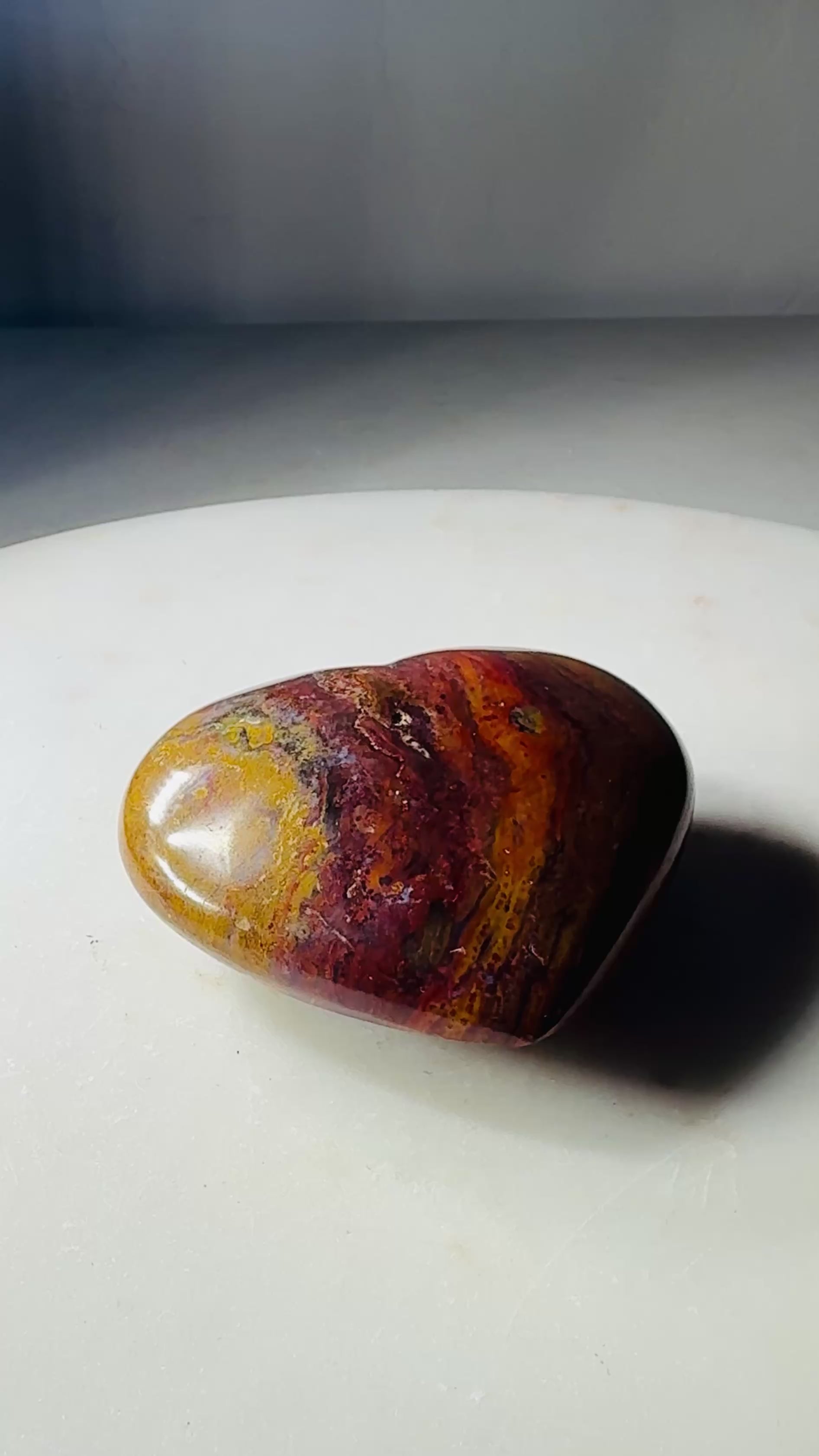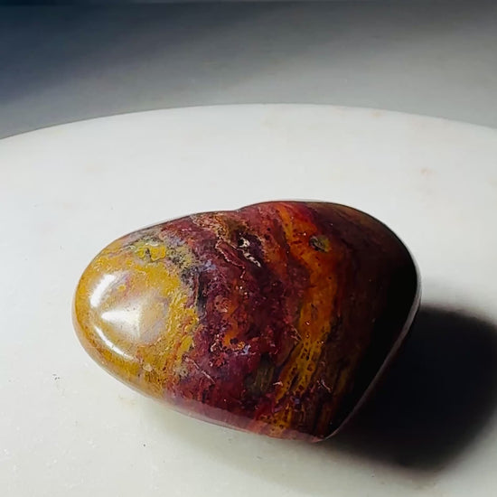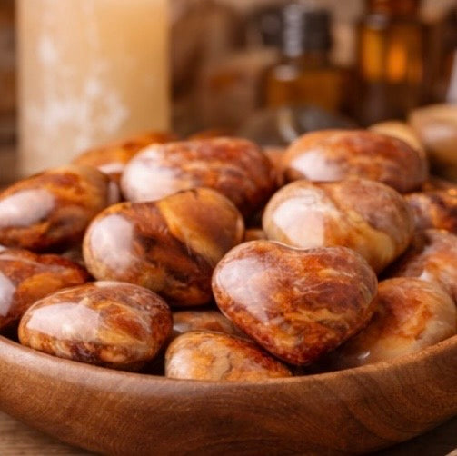A polished Sunset Jasper heart carving featuring warm, earthy tones inspired by desert landscapes—blends of rust, sand, ochre, and soft muted reds with natural banding and pattern movement. Each heart is handpicked by us for color harmony, pattern depth, and overall visual balance. Natural variations and inclusions ensure every piece is one of a kind.