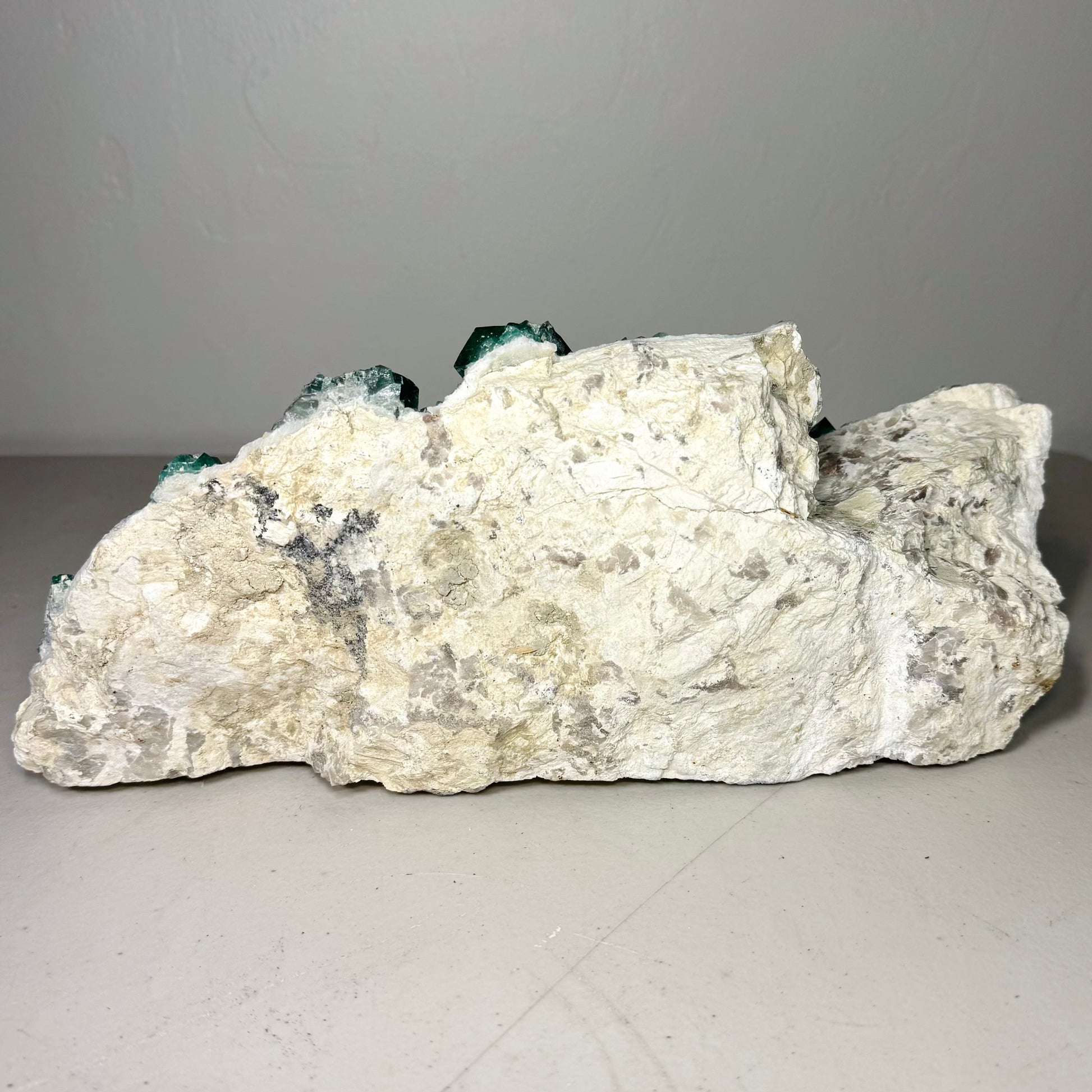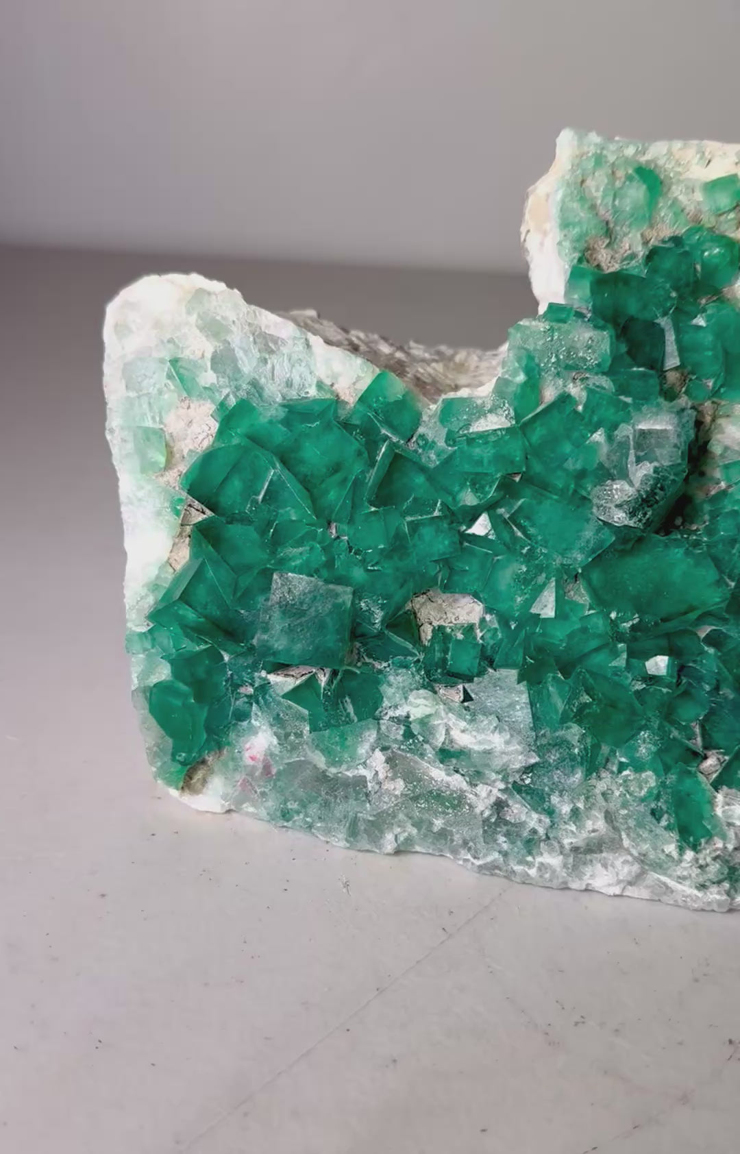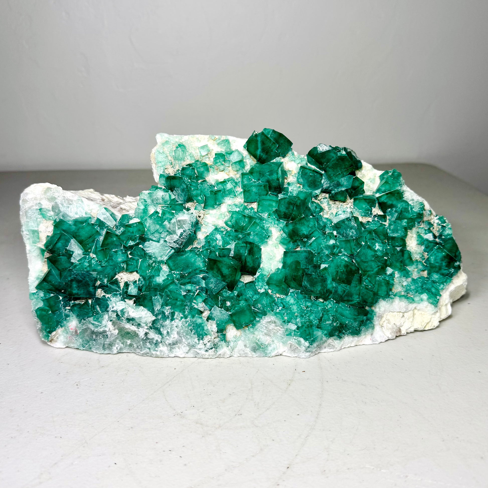 This striking large Green Fluorite specimen features vivid cubic crystals in shades of deep emerald and sea-glass green, naturally growing across a white and beige matrix. The contrast between the translucent fluorite cubes and their pale host rock creates a captivating visual effect. Each crystal face catches the light beautifully, revealing hints of internal zoning and glassy luster.